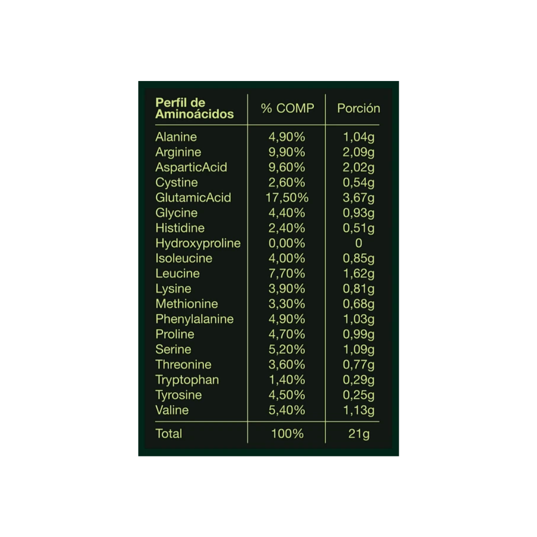 - Proteína vegetal de alto valor biológico, formulada a partir de la combinación de arroz y cañamo para lograr una proteína completa de alto valor biológico y a la vez hipoalergénica, ya que no contiene soya ni otros componentes alérgenos